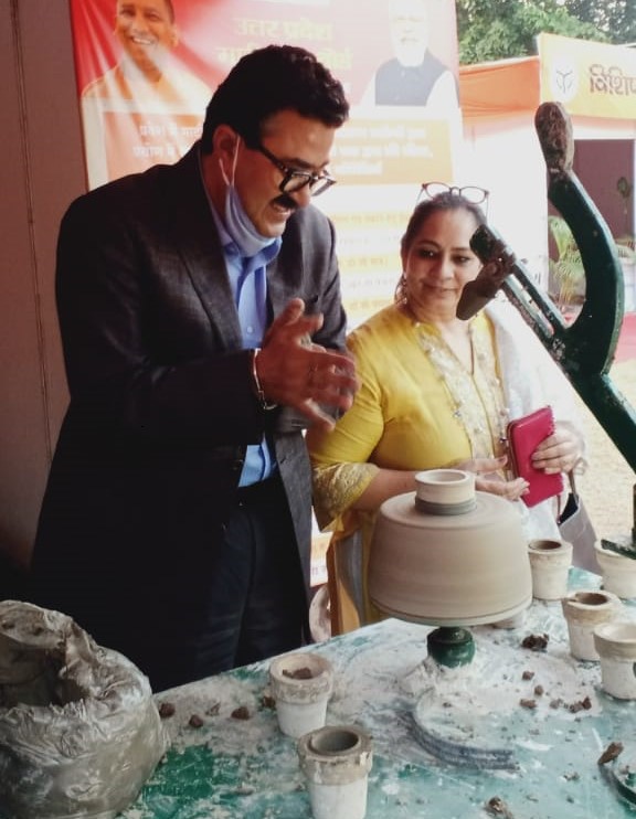 लखनऊ | अपर मुख्य सचिव, खादी एवं ग्रामोद्योग डा0 नवनीत सहगल आज गोमती नगर स्थित उ0प्र0 संगीत नाटक अकादमी परिसर में आयोजित 10 दिवसीय माटीकला मेले में पहुंचे। उन्होंने कारीगरों का उत्साहवर्धन करते हुए अपने हाथ से जिगर-जाली पर मिट्टी का कप बनाया। साथ ही प्लास्टर आफ पेरिस के मोल्ड से मिट्टी के दिये को आकार भी दिया। इस मौके पर श्रीमती वंदना सहगल भी मौजूद थीं।