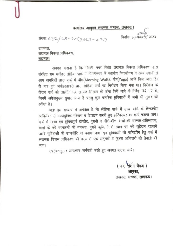 लखनऊ। लखनऊ की कमिश्नर डा रोशन जैकब गोमती नगर स्थित एलडीए के लोहिया पार्क के रखरखाव व नागरिक सुविधाओं से संतुष्ट नहीं हैं उन्होंने नाराजगी जताते हुए एलडीए वीसी को पत्र लिखकर सुधार करवाने के निर्देश दिए हैं ।